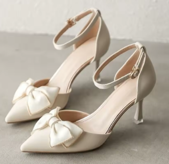 "أحذية نسائية أنيقة بكعب متوسط، تصميمها مقدمة مدببة مع لمسة فراشة راقية تعطي إطلالة ناعمة وأنثوية. مثالية لفستان حفلات الزفاف أو أي مناسبة رسمية باللون الأبيض، تجمع بين الراحة والأناقة في نفس الوقت. تصميمها الكلاسيكي يبرز جمال القدم ويكمل إطلالتك بشكل مثالي."