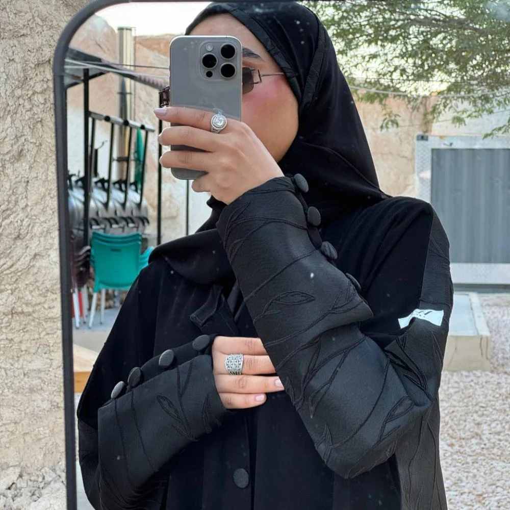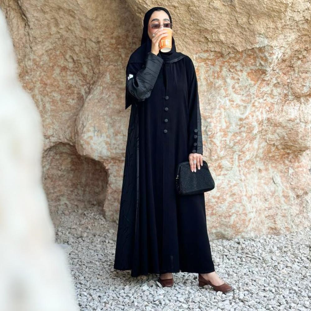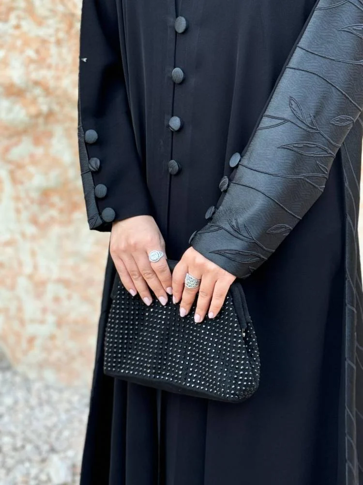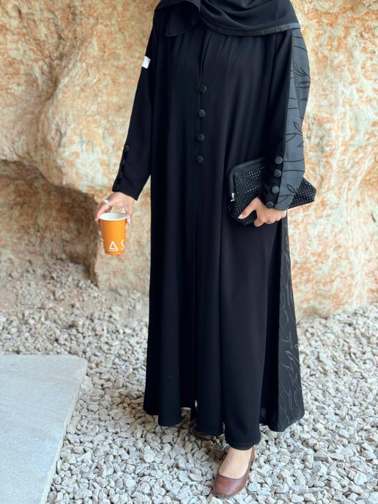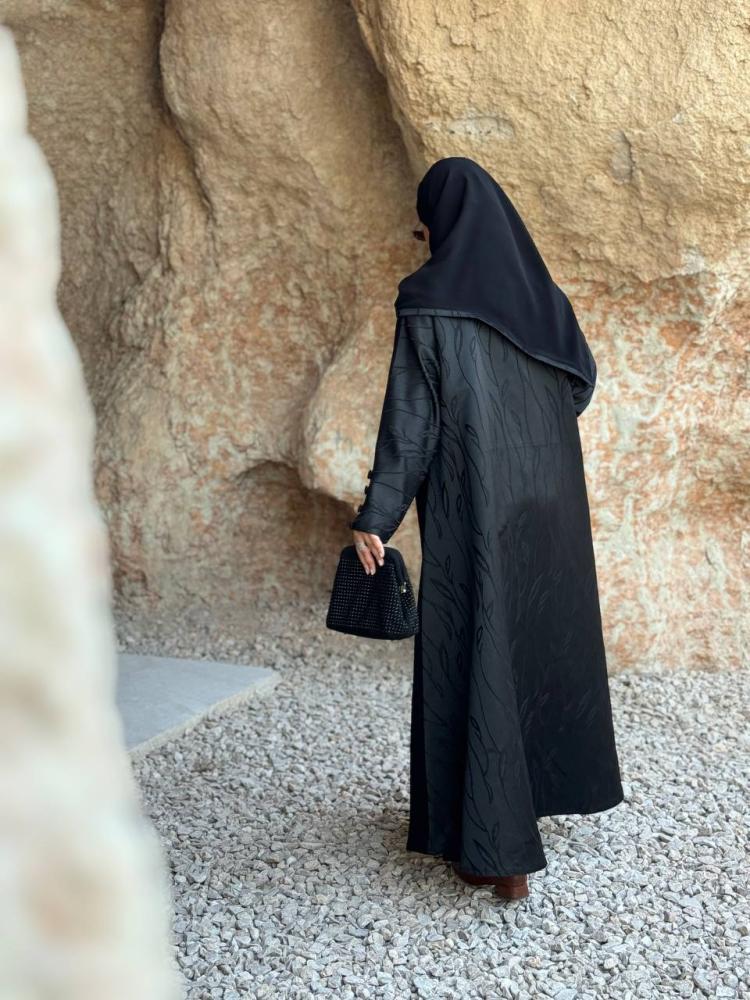 "عباية أنيقة مصنوعة من قماش كريب سواد فاحم، مريح وفاخر ومناسب للشتاء. الجزء النص جاكار مطرز يعطي لمسة فخامة ورقي، والقصة نص كلوش تمنح حركة وأناقة لكل إطلالة. الأكمام مصممة من نص جاكار ومعاها أزرار تضيف تفاصيل جذابة. تجي مع طرحة ساده بطرف من نفس قماش العباية لإطلالة متكاملة وأنيقة."